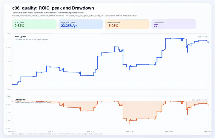 That is why quote-aware fills became a research requirement in the CuteMarkets strategy work. The goal was not to add complexity for its own sake. The goal was to stop pretending that every attractive chart translated into an executable option trade.